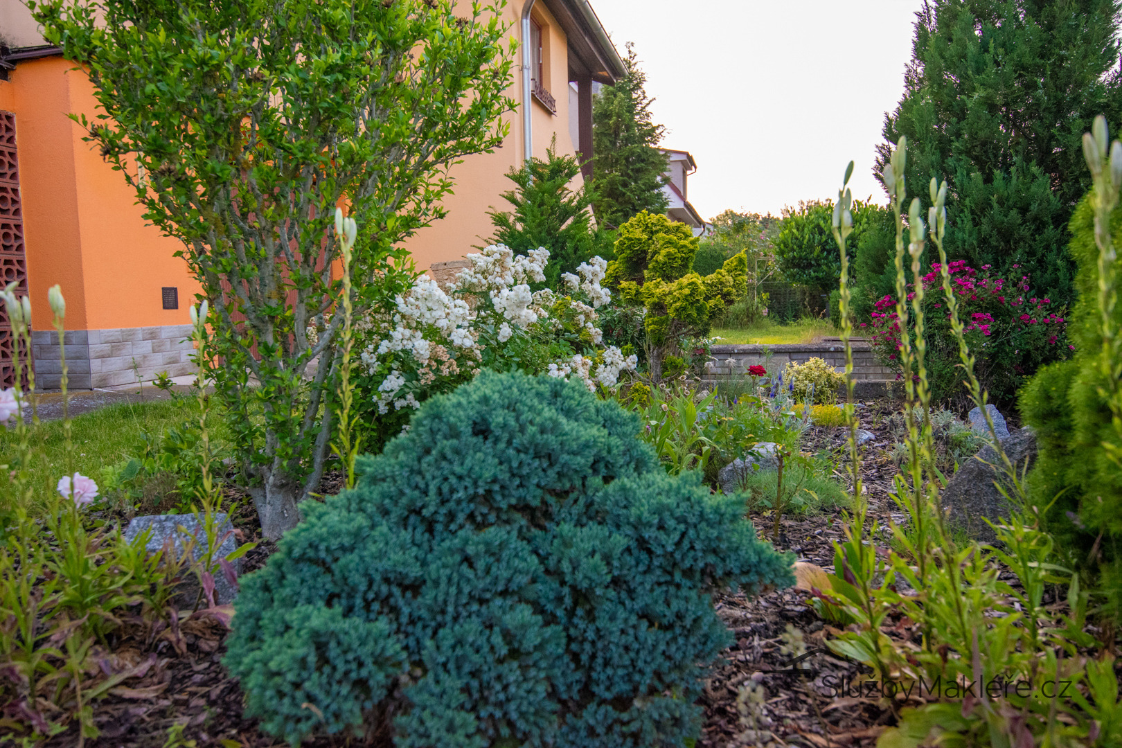 Pečlivě udržovaná zahrada s okrasnými dřevinami, vzrostlou jabloní a třešní, keři, květinami a skleníkem nabízí prostor pro relaxaci i pěstování vlastních plodin.