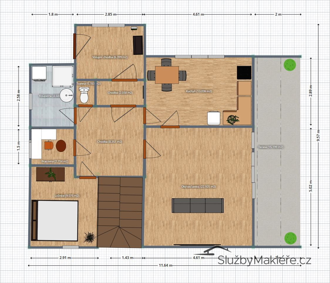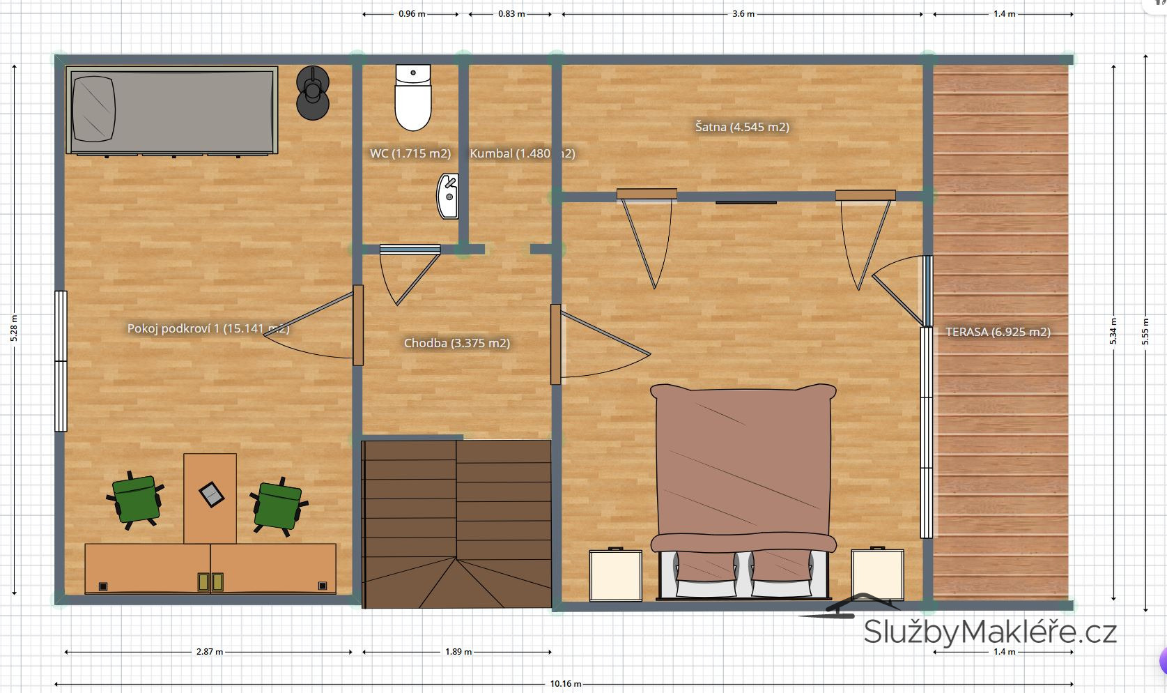 Patro: Dvě ložnice, chodba se samostatným WC a komorou; jeden z pokojů má vstup na balkon, po délce jednoho pokoje vestavěná šatna s dostatkem úložného prostoru.